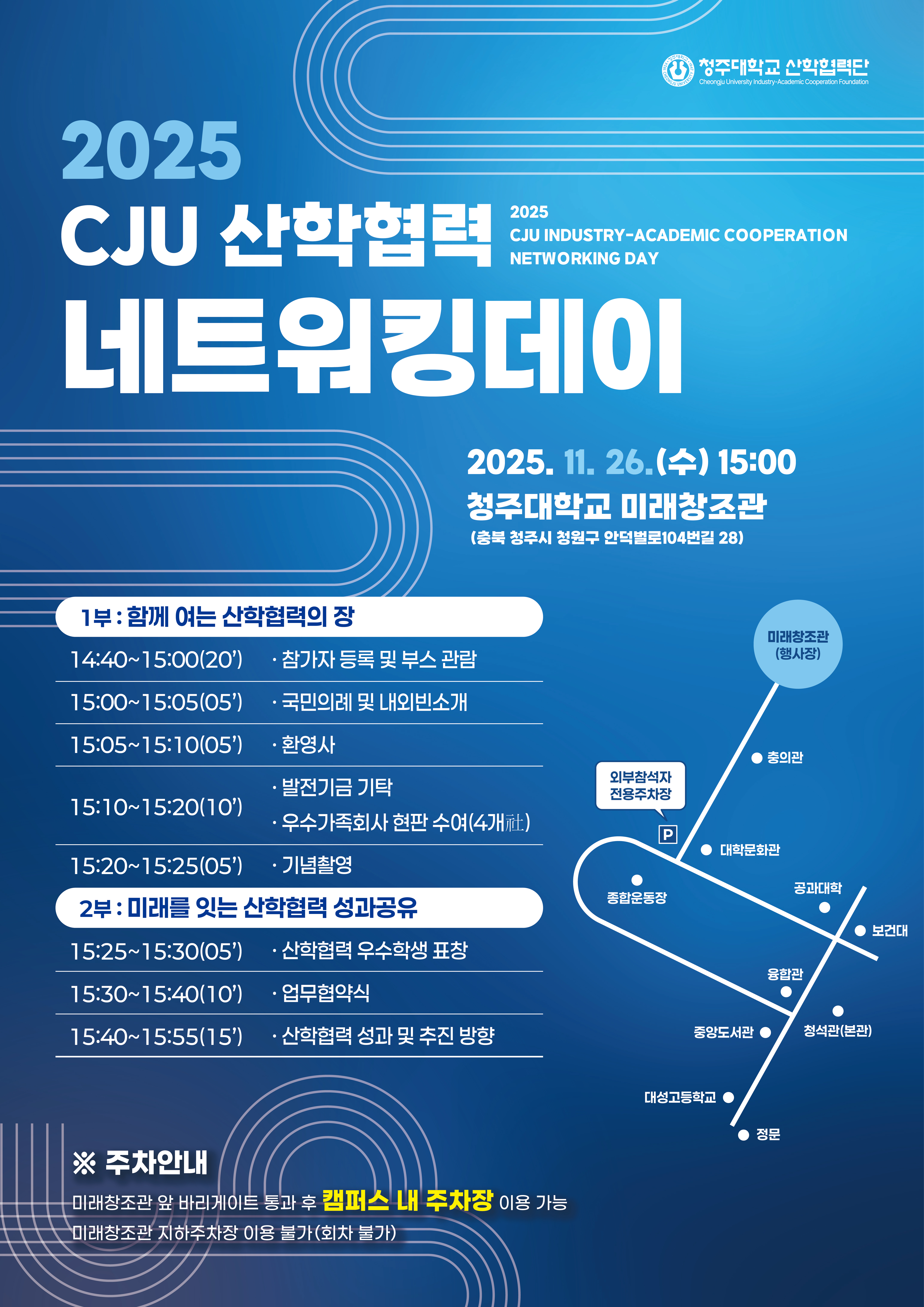 ○ 주최/주관 : 청주대학교 대학혁신사업단/ 청주대학교 산학협력단 ○ 일 시 : 2025. 11. 26.(수) 15:00~ ○ 장 소 : 미래창조관 로비 4학년 재학생 및 졸업생들의 많은 관심과 참석 바랍니다. |