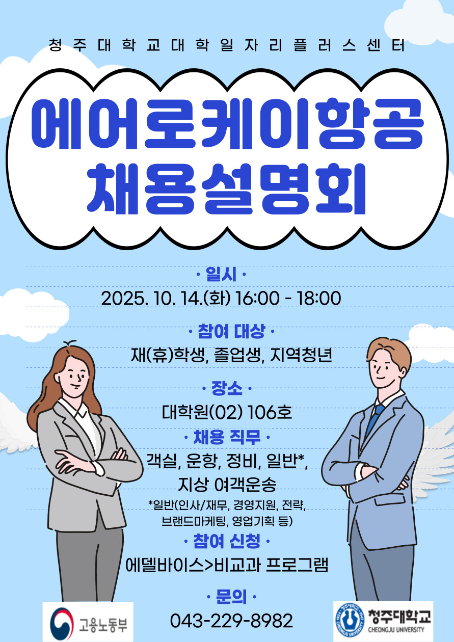 ○ 일시: 2025. 10. 14.(화) 16:00~18:00 ○ 장소: 대학원(02) 106호(세미나실) ○ 참여대상: 청주대학교 재(휴)학생, 졸업생, 지역청년 ○ 내용: 에어로케이항공 기업 소개 및 채용 안내, 에어로케이 충청권 지역 인재 리쿠르팅 현장 채용(11월 3일) 설명 등 ○ 채용 직무: 객실, 운항, 정비, 일반(인사/재무, 경영지원, 전략, 브랜드마케팅, 영업기획 등), 지상 여객운송 ○ 참여혜택 : ① or ② 중 선택 ① 점프업 IAP계획 활동 인정(재맞고 수당)/ 프로그램 시작전 필수 IAP 계획 반영 필수 ② 역량마일리지 150점(프로그램 종료일 포함 7일 이내 만족도조사 참여 시 지급 가능) - 마일리지 지급항목: 취업역량강화 프로그램 / (취업) 2시간 이상 프로그램 150점 ※ 유의사항: 재맞고 수당 신청자는 마일리지 중복 혜택 불가!! ○ 참여신청: 에델바이스>비교과프로그램 ○ 문의 : 043-229-8982(대학일자리플러스센터) |