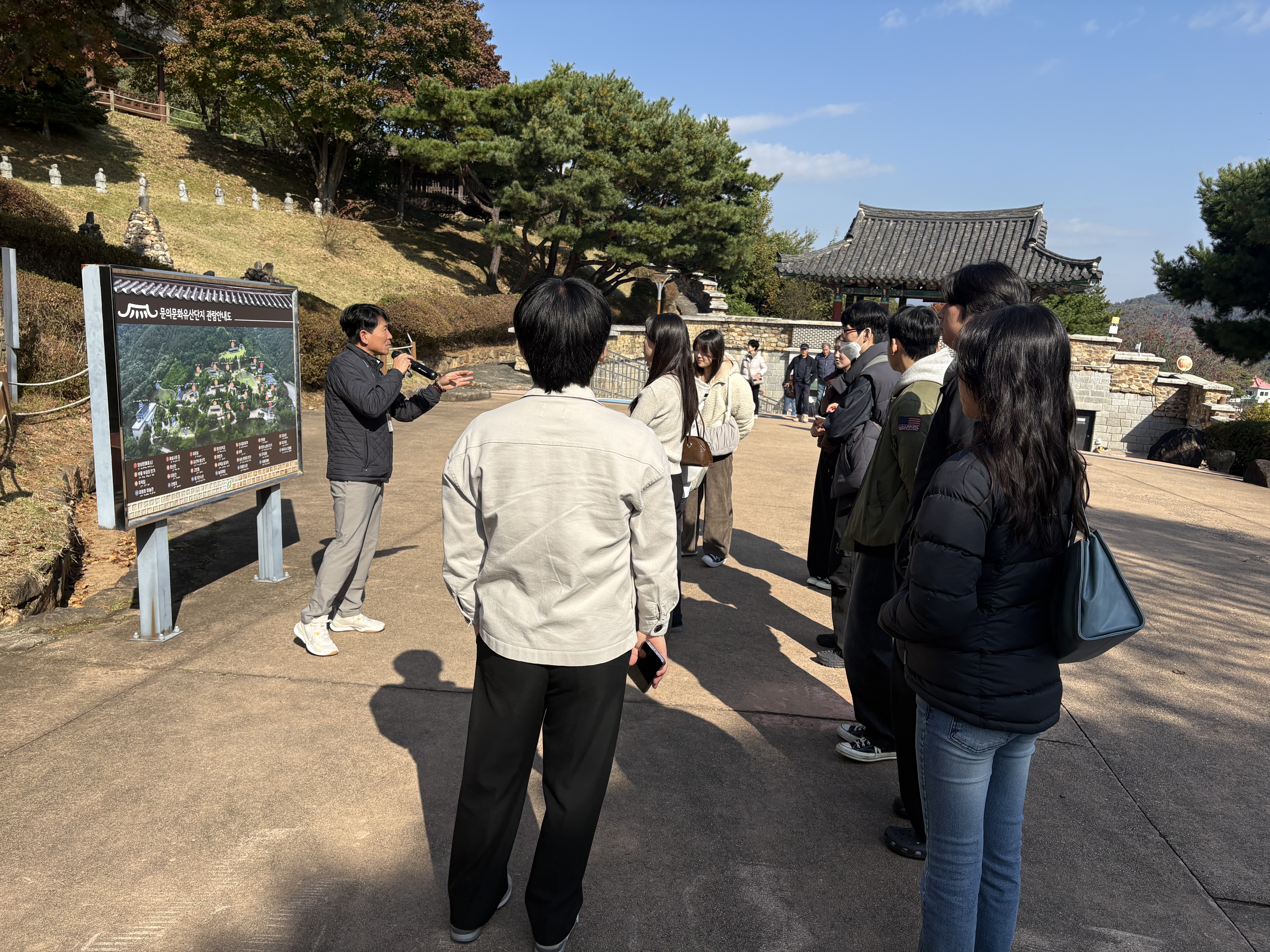 이번 프로그램에는 외국인 유학생들도 함께 참여하여 지역 문화유산에 대한 설명을 듣고, 청주의 문화 아카이빙 활동에 대해 배우는 뜻깊은 시간을 가졌습니다. 학생들은 재단지 곳곳을 둘러보며 자료를 수집하고 영상 촬영을 병행하였으며, 전통 신앙의 상징인 솟대와 전통 건축미의 정수인 단청을 가까이에서 감상하며 한국 전통문화의 아름다움을 체험했습니다.