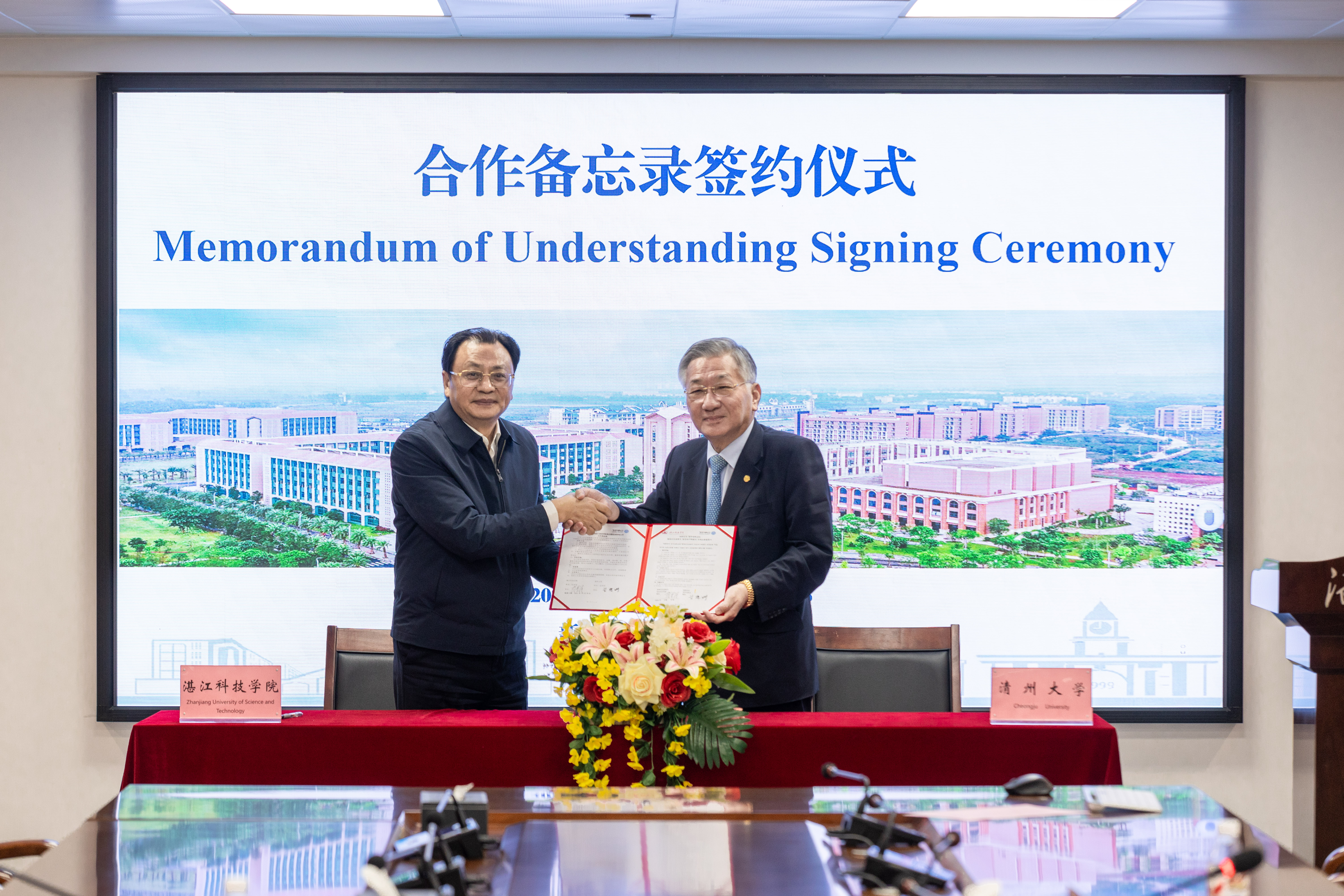 광동해양대학교와의 협정식에는 유문화(리우원화·劉文華) 총장을 포함한 대학 관계자 3명이, 잠강과기학원 협정식에는 유민(리우민·李敏) 이사장을 포함한 대학 관계자 3명이 참석했다.